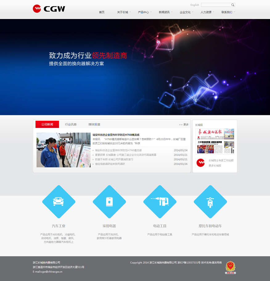瑞安市50强工业企业,长城企业创建于1993年,现有占地面积 50,000平方米,现有员工1,450余人,专业技术人员300余人。